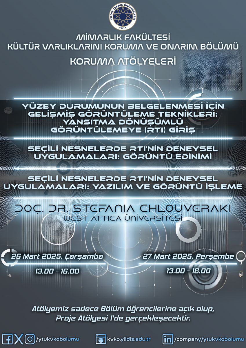 5- Stefania Chlouveraki, Yüzey Durumunun Belgelenmesi İçin Gelişmiş Görüntüleme Teknikleri: Yansıtma Dönüşümlü Görüntülemeye (RTI) Giriş ve Seçili Nesnelerde RTI'nin Deneysel Uygulamaları: Görüntü Edinimi ve Seçili Nesnelerde RTI'nin Deneysel Uygulamaları: Yazılım ve Görüntü İşleme, 26-27 Mart 2025, YTÜ KVKO Bölümü Proje Atölyesi 1